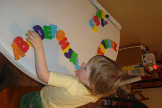 Gwendolyn and I laid out the bathtime letters on the table to do some alphabet work, only to discover that the "C" was missing. So we spent ten minutes scouring the upstairs looking for the missing yellow C, singing about what we wouldn't be able to do if we didn't have a C.